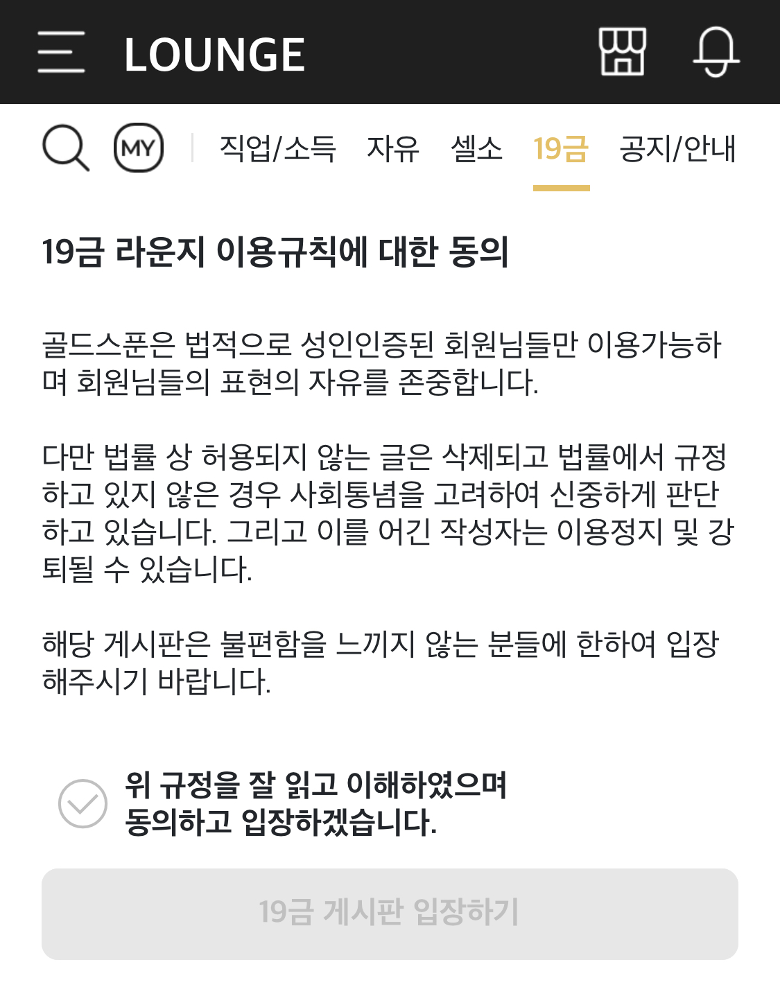 골드스푼 라운지 내의 19 게시판을 처음 들어오면 이런 경고가 뜬다.